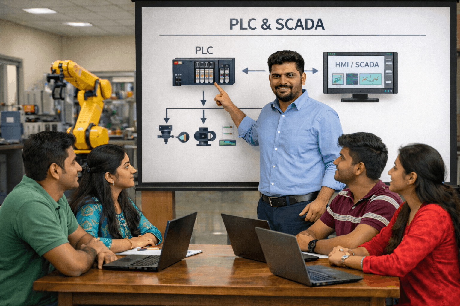 At Robotriq, we offer industrial automation training in Coimbatore to build both knowledge and practical skills. Our industry-focused courses cover PLC, SCADA, HMI, VFD, and IIoT with hands-on training and real-time projects. Whether you are a student, engineer, or working professional, our flexible modules help you gain the skills and confidence needed to succeed in today’s automation-driven industries.