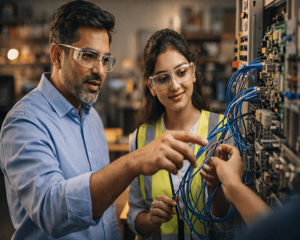 The program covers electricity fundamental principles and electrical machines and power distribution and panel design and AutoCAD Electrical and safety and testing and maintenance and project execution.